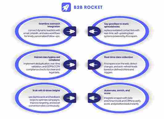 Use tools like native APIs to connect your scrapers and enrichment services with your CRM (e.g., B2B Rocket) or a Google Sheet. Typical workflow: